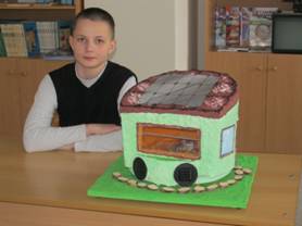 Дом изготовили из материала пеноплекс. Он является хорошим теплоизоляционным материалом. Чтобы придать дому форму цилиндра, пеноплекс нагреваем феном и изгибаем. Вырезаем дно и крышу дома. Все детали соединяем клеевым пистолетом. На передней стене дома вырезаем отверстие для окна и закрываем его двойным оргстеклом. Дом устанавливаем на вращающуюся платформу и закрепляем на ней. Вращение дома происходит посредством электрических двигателей. Для того чтобы дом самостоятельно поворачивался за солнцем на его стенках закреплены два фотоэлемента, подающие сигнал на управляющую схему. При освещении фотоэлемента открывается транзисторный ключ и включается реле, которое включает двигатель. В зависимости от освещенности фотоэлементов дом поворачивается в сторону солнца. Дом штукатурим и окрашиваем (рис.1).