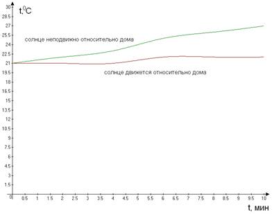 Как видно из полученных данных повышение температуры во втором случае не столь значительно, а, следовательно, энергетическая выгода от использования вращения дома очевидна (рис.3).