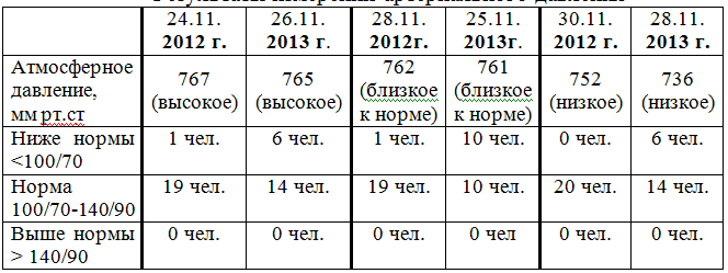 Во время измерения артериального давления у учащихся в 2012 году, мы интересовались их самочувствием. Особенно плохое самочувствие у учащихся нашей школы наблюдалось 29 и 30 ноября 2012 года. В эти дни наблюдался спад атмосферного давления. 29 ноября оно составило 759 мм рт. ст., а 30 ноября – 752 мм рт. ст. В эти дни у учащихся наблюдалась сонливость, быстрая утомляемость, некоторые учащиеся жаловались на головные боли, а некоторые – испытывали чувство тревожности.