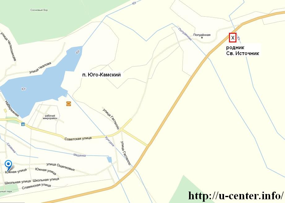 После учебного 2011 – 2012 года при школе была организована летняя площадка. У меня набралась группа ребят, большинство которой составляли дети из «Юного исследователя». Была разработана программа по исследованию родника «Святой источник» (родник находится в 2 км от поселка Юго-Камский вблизи автотрассы), в которой мы начали системное изучение данного подземного источника (см. карту-схему 2).